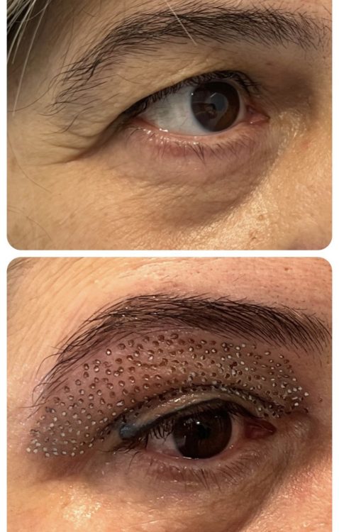 Tras la blefaroplastia con Láser CO2, la piel presenta unas pequeñas lesiones superficiales puntiformes que enseguida se convierten en costras que suelen caer en un intervalo de 5-7 dias, dejando tras de ello la aparición de una piel nueva renovada.
